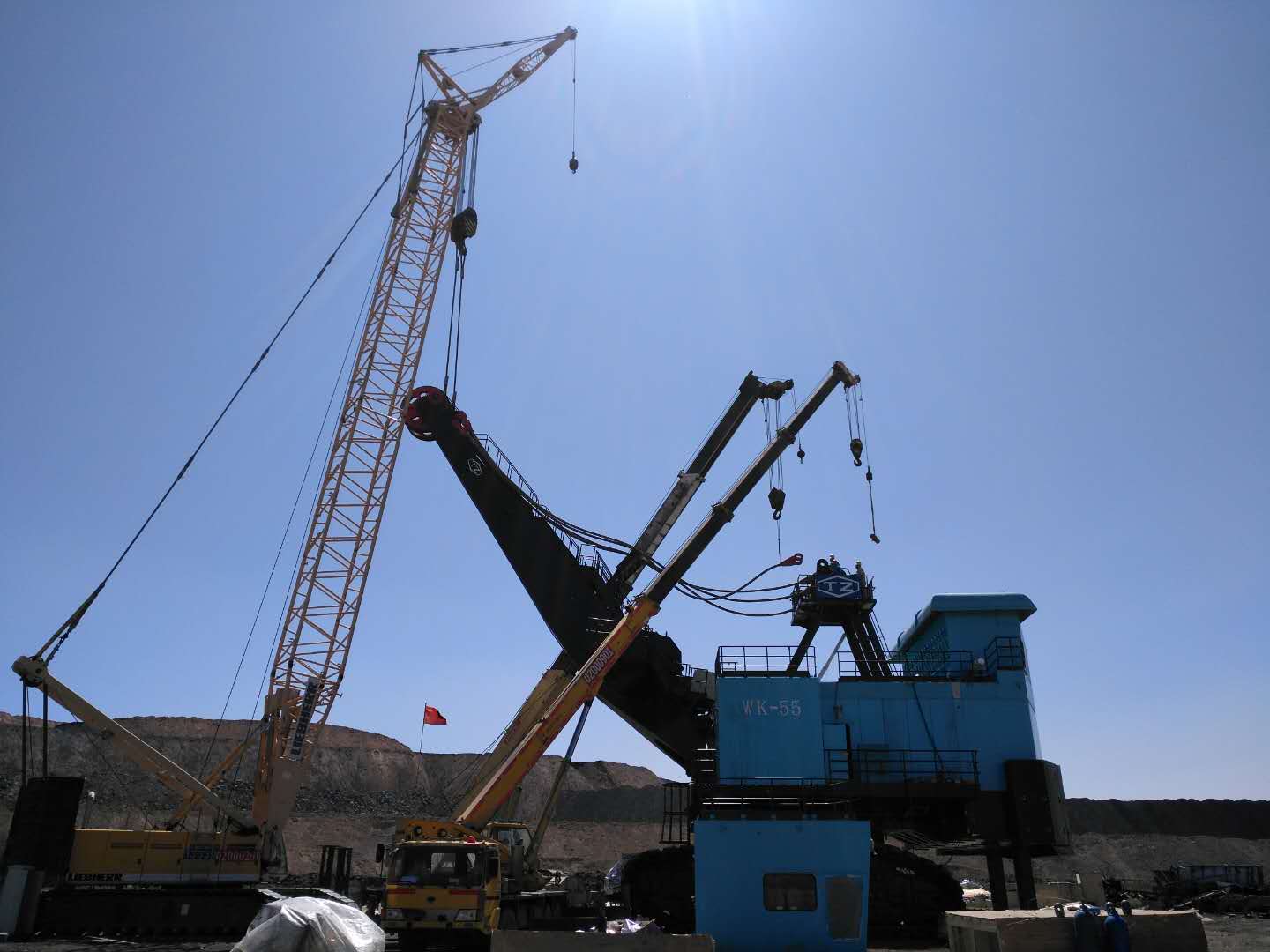 近日,从矿山设备分公司准格尔 WK-55电铲现场安装项目组传来好消息:在疫情防控的特殊时期,项目组全体成员肩负使命、攻坚克难,历时 61 天,提前一周完成现场安装调试任务!意味着又一台“TZ”牌世界第二大矿用挖掘机巍然屹立在了准格尔黑岱沟露天矿!